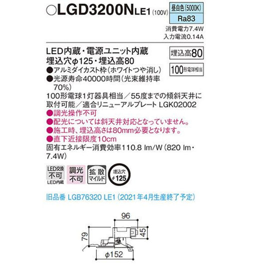 ベースダウンライトLED一体型 昼白色 5000K ホワイト 電源ユニット内蔵 調光不可 LGD3200NLE1