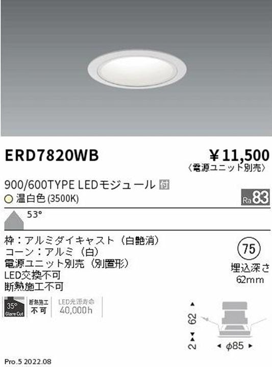 グレアレスダウンライト 900/600タイプ φ75 3500K 温白色 電源別売 ERD7820WB
